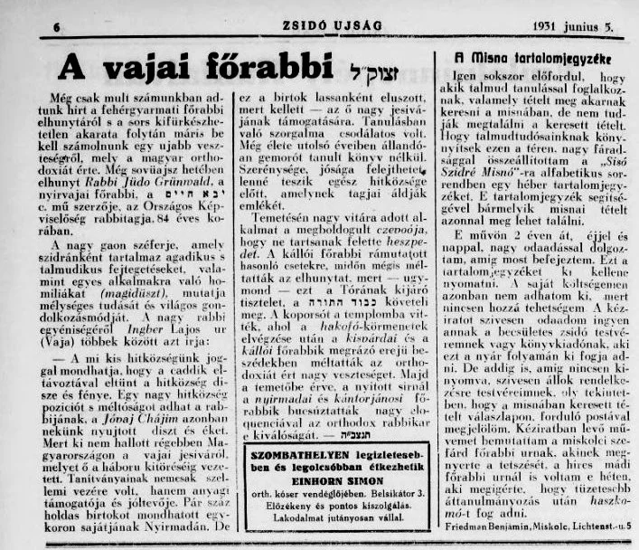 A "zsidó újság" című ortodox újság halála után ír az áldott emlékű Grünwald rabbi életéről és munkásságáról